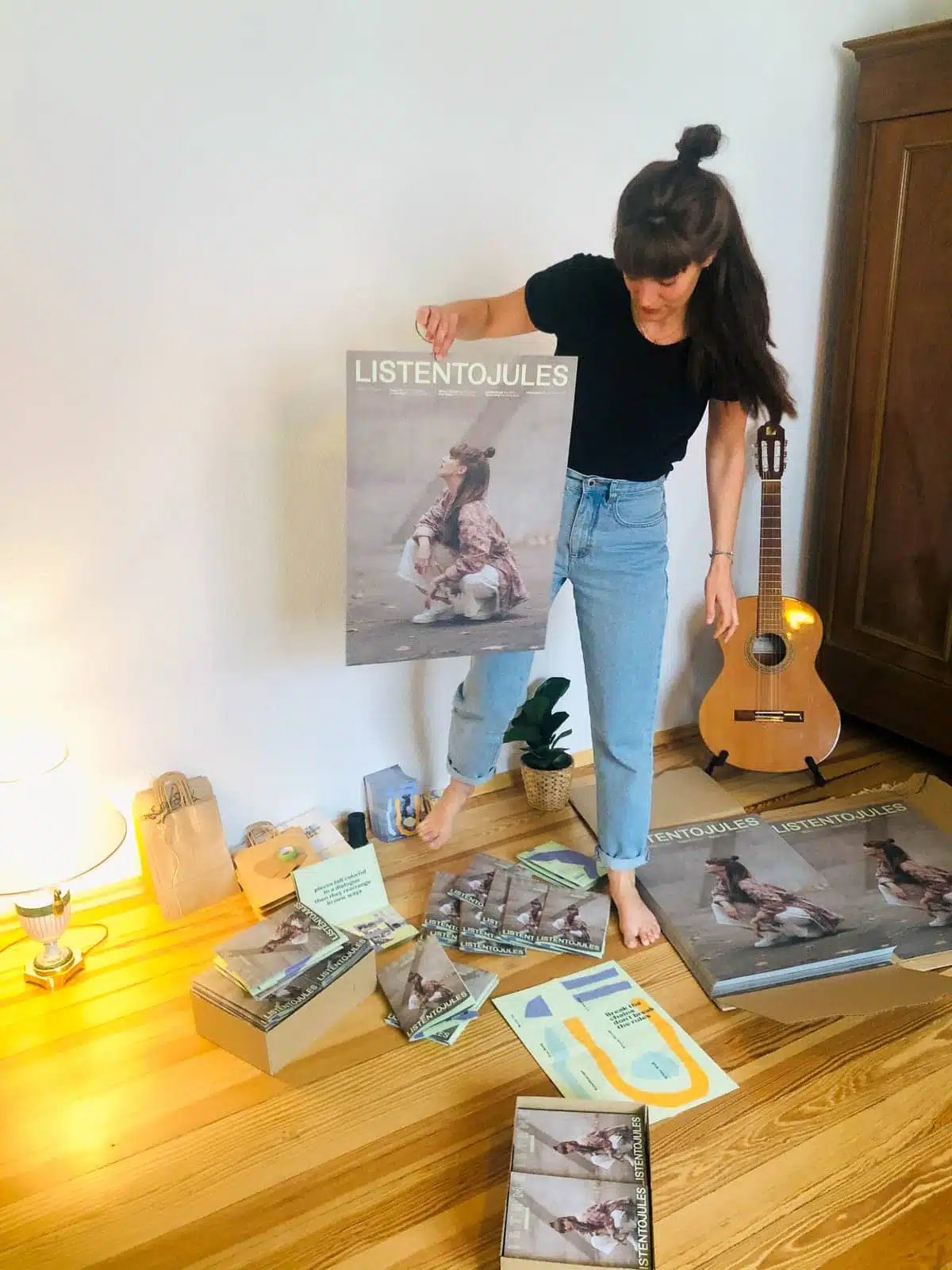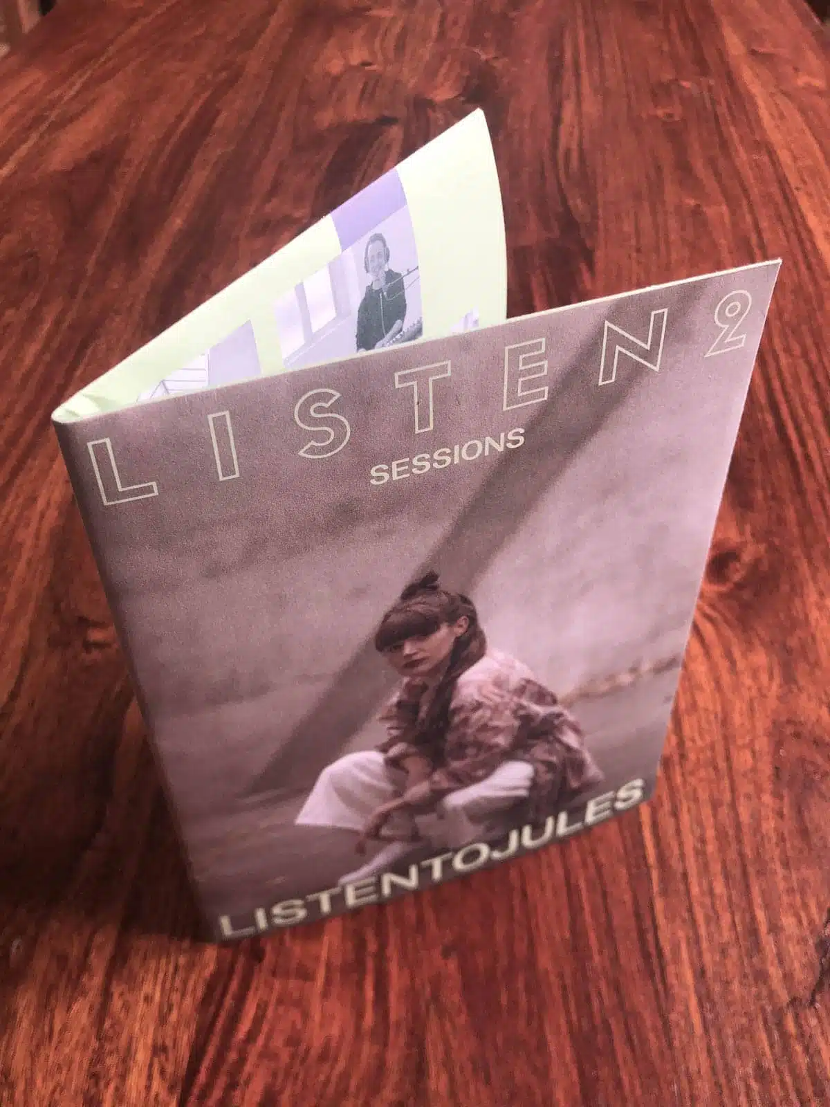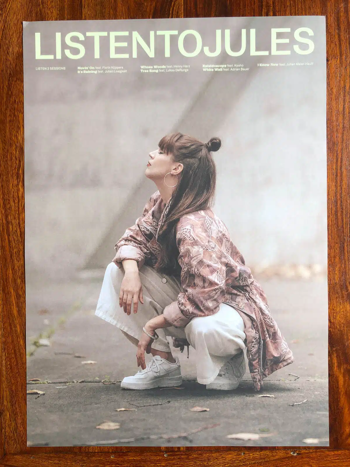 Singer-songwriter listentojules released the awarded “LISTEN 2 SESSIONS” EP on 06/25/2021. She invited 7 features to record and film her songs live in impressive and different locations. The “Listen 2 Sessions” EP was not released as a CD or vinyl pressing for the sake of the environment, but as a posterzine in modern design by Camilla Schröer. The posterzine is a mixture of magazine and poster, which was printed climate neutral with organic inks on 100% recycled paper and contains photos, song lyrics and a personal download code.