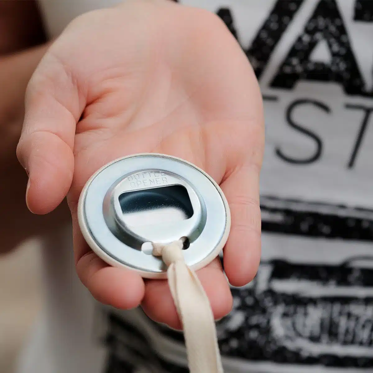 Dieser Button kommt ganz ohne Kunststoff aus – Er ist mit hochwertigem Baumwollstoff bezogen und wird mit einem Baumwollband mit Holzperle geliefert.
